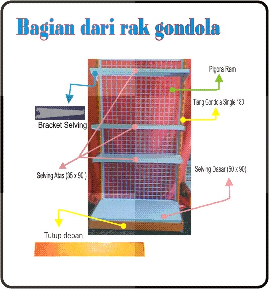 Biasanya Gondola terdiri dari 2 tiang, 1 bh ram/wire mesh,beberapa selving